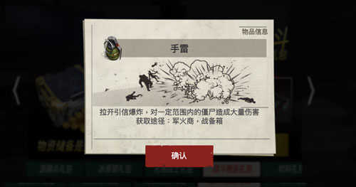 拉开引信爆炸,投掷后对一定范围内的僵尸造成大量伤害。手雷威力巨大,且不会受到区域限制,一般在主线或者支线关卡遇到大量聚集性僵尸时使用。