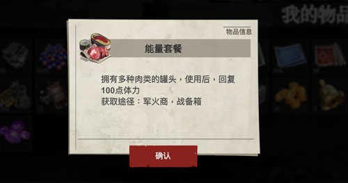 指压缩饼干和能量套餐,能快速补充能量恢复角色体力。其中能量饼干使用后恢复10点体力,能量套餐则可恢复100点体力。