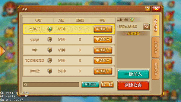点击“创建公会”或“一键加入”或“申请加入”目标公会。