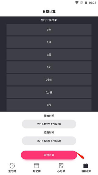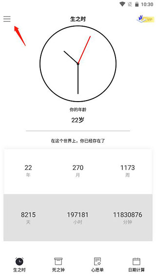 2、进入应用后在生之时中可以看到自己已活的年、月、日、小时、分钟是多少;