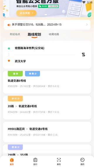 武汉智能公交APP拥有非常全面的出行服务功能,可以帮助用户线上查询最优出行路线,自动导航,扫码乘车更加方便,还有车辆班次时间服务,让用户不错过下一趟车!