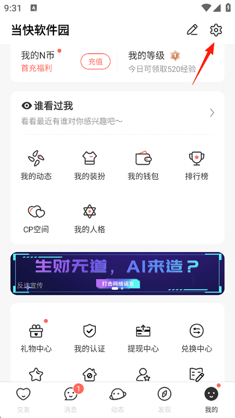 1、点击我的-右上角的设置图标。