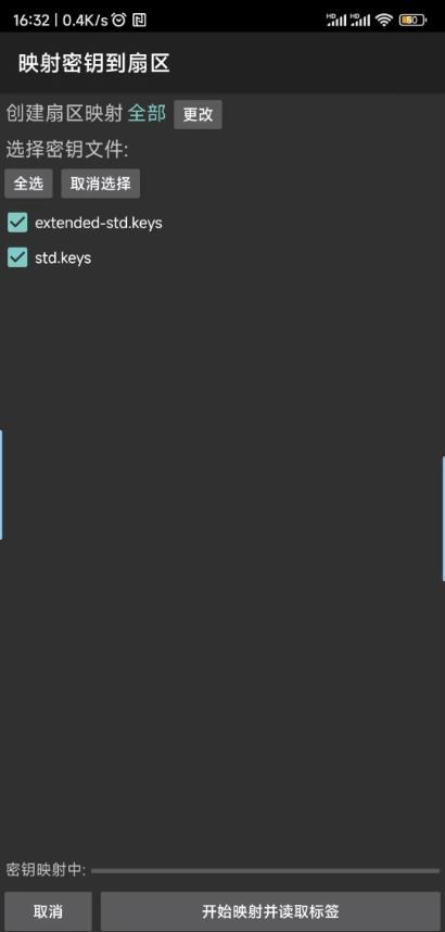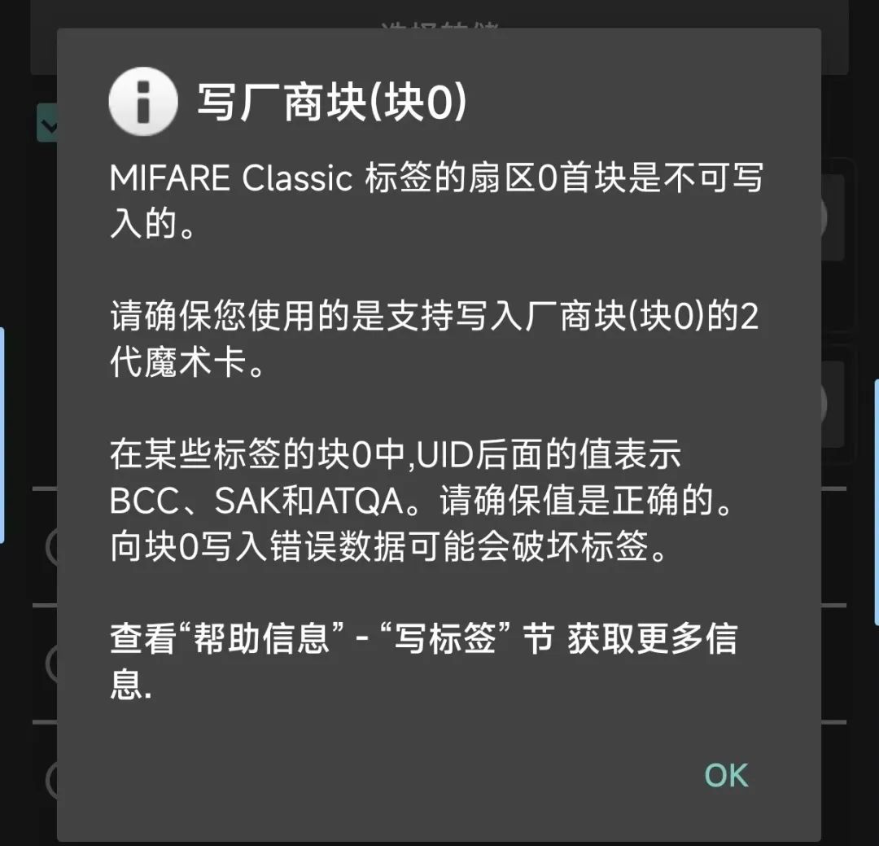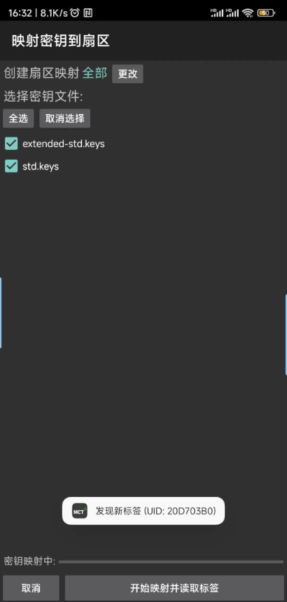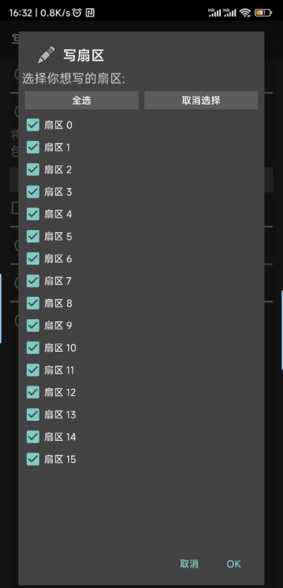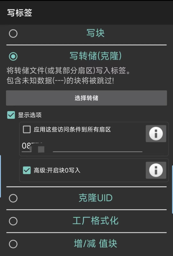勾选刚刚保存的标签,选择后点击软件最下方“选择转储”进行下一步操作(此时将CUID空白卡至于手机NFC感应区);根据自己需求选择扇区数据数据,然后点击软件最下方“好的”进行最终写入模拟操作