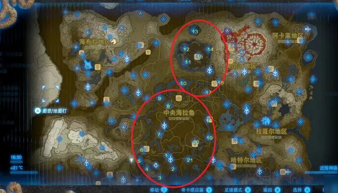 将塞尔达地图分为9个区域—中央海拉鲁、丘陵地区、哈特尔地区、费罗尼地区、拉聂尔地区、阿卡莱地区、奥尔汀地区、海布拉地区、格鲁德地区,将各区域内的神庙按顺序标记号码,供逐一对照查找。
