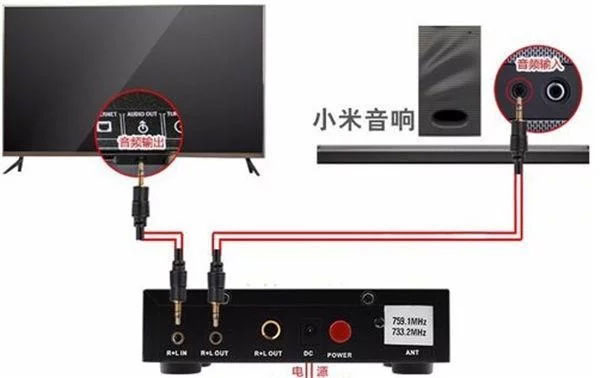 2、在音响上找到3.5mm音频输入插孔,再用线连接话筒主机输出跟音响