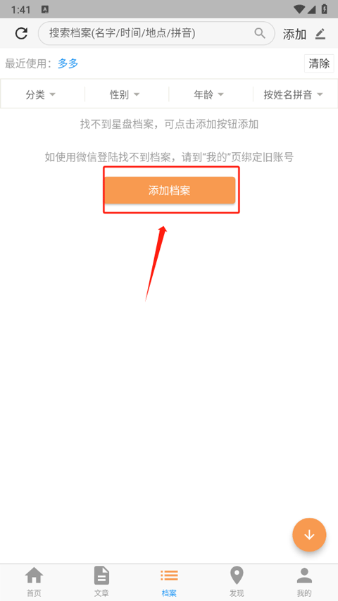 1、打开app后,首先档案界面上点击添加档案