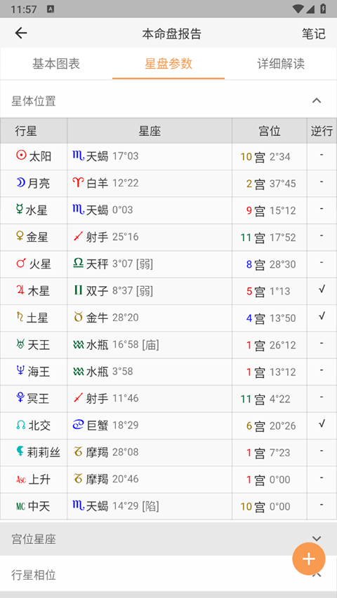 6、如果不清楚星盘报告上的图标显示,你可以点击图上的图标查看详细信息,也可以点击左下角橙色菜单进行查看